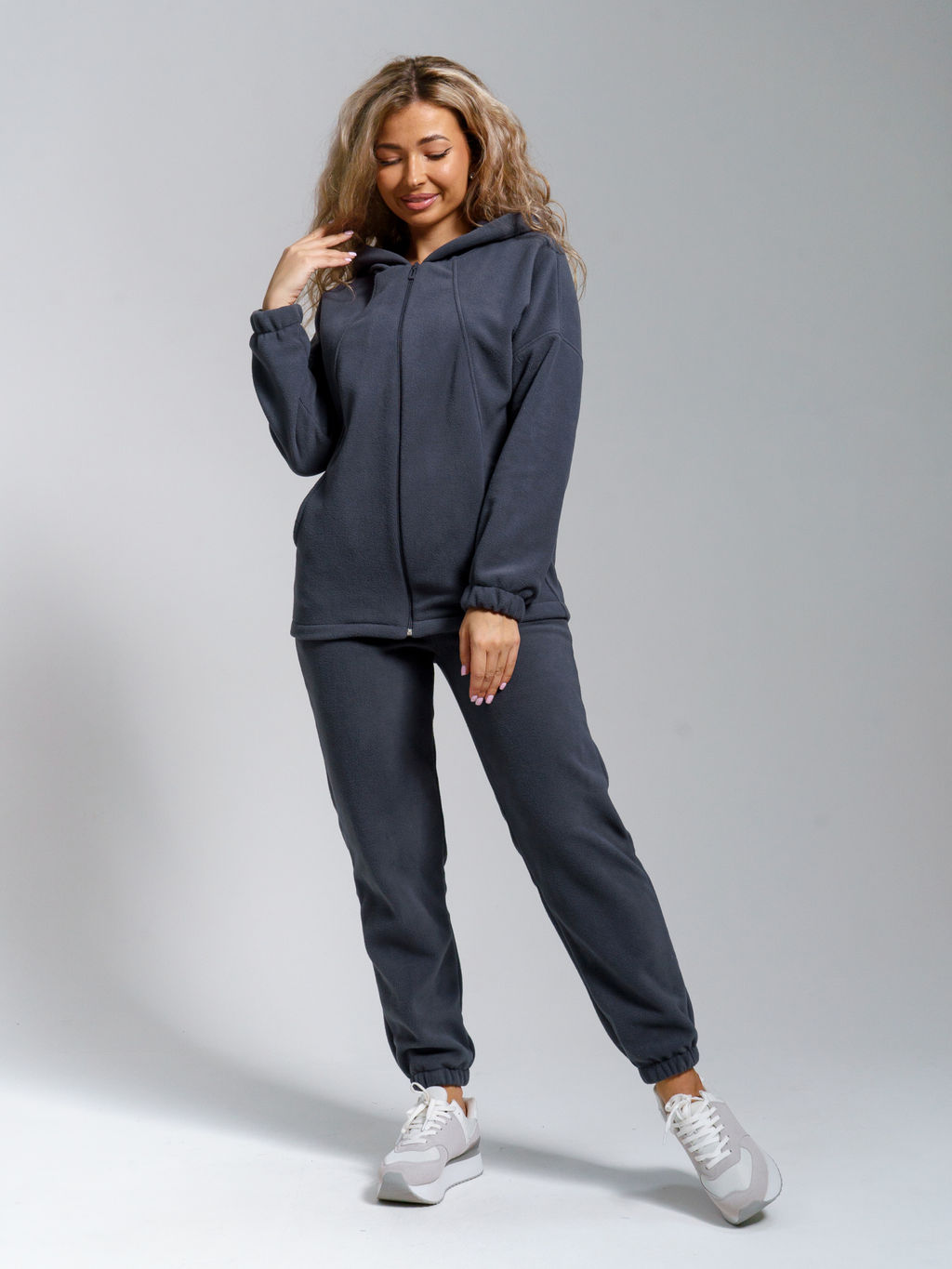 Теплый домашний костюм для женщин из мягкого высококачественного флиса приятен к телу, отлично сохраняет тепло и пропускает воздух. Стильная толстовка с двойным воротником-стойкой на молнии защищает от ветра и холода, а свободный крой подходит для любого типа фигуры. Удобные джоггеры на резинке с наклонными карманами и притачным поясом обеспечивают идеальную посадку.