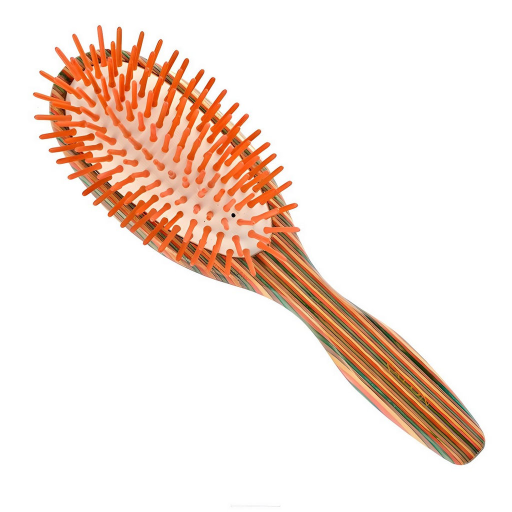 Деревянная, цветная, зубцы - деревянные штифты, L 210 мм. Уникальная серия расчесок, основание которой набраны из множеств разноцветных слоев дерева, а специальное расположение крупных деревянных зубцов позволяет с легкостью расчесывать даже сильно вьющиеся волосы.