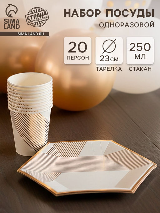 • Посуда одноразовая бумажная на 20 персон, 40 предметов, бело-золотой цвет