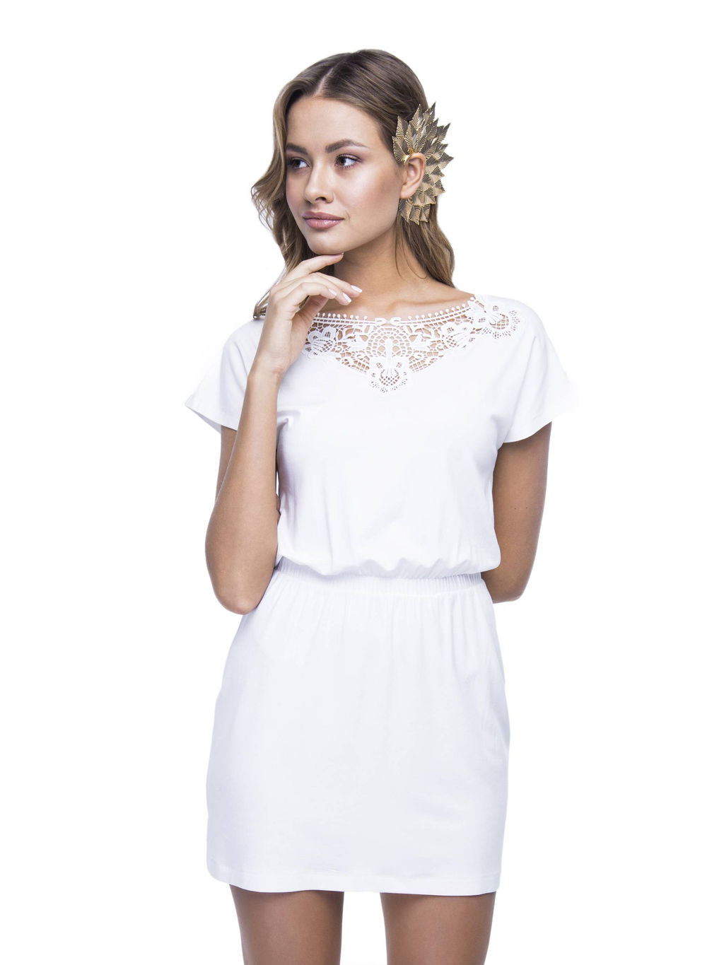 Туника женская из однотонного трикотажного полотна. Рукав короткий цельнокроенный. Линия плеча-спущенная. По переду изделия-кружевная вставка. В области талии-декоративная сборка на эластичную тесьму­