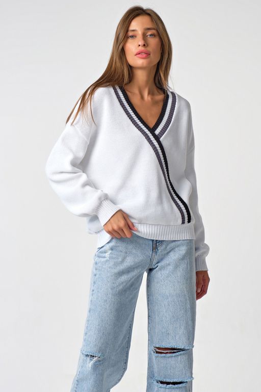 Особенности: Вязаный джемпер с иммитацией запаха. Низ изделия, рукава, воротник оформлены резинкой в рубчик.