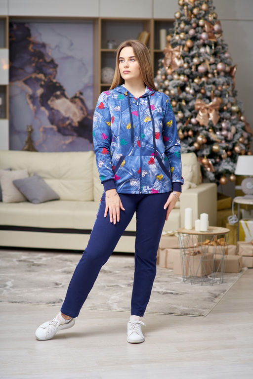 Костюм женский с капюшоном из футера отлично подойдет для любителей активного отдыха, прогулок, экстремального туризма. Спортивный костюм для женщин не стесняет движений, и не создает неудобств при физических нагрузках. На полочке толстовки карман-кенгуру, рукава и низ брюк обработаны манжетом из кашкорсе. Широкий размерный ряд женского костюма подойдет для всех типов фигур, в том числе для женшин больших размеров. Худи костюма "оверсайз", брюки на эластичном поясе поэтому костюм будет прекрасным вариантом для беременных женщин.­