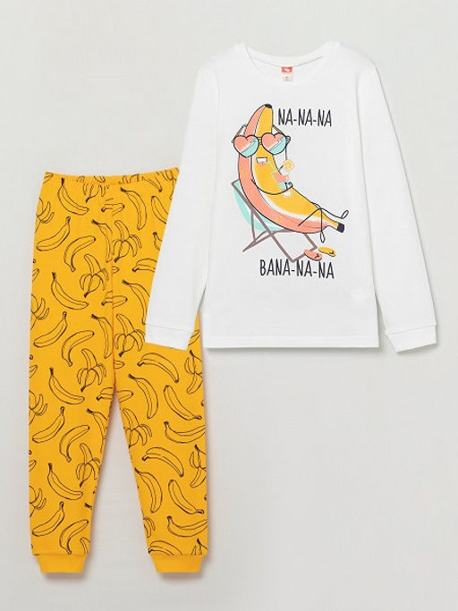 Джемпер с длинными рукавами и принтом спереди. Рукава с манжетами из эластичного полотна по низу. Горловина круглая, обработана притачным воротником из полотна с эластаном. Брюки из набивного полотна с манжетами по низу. На талии брюки собраны на резинку.