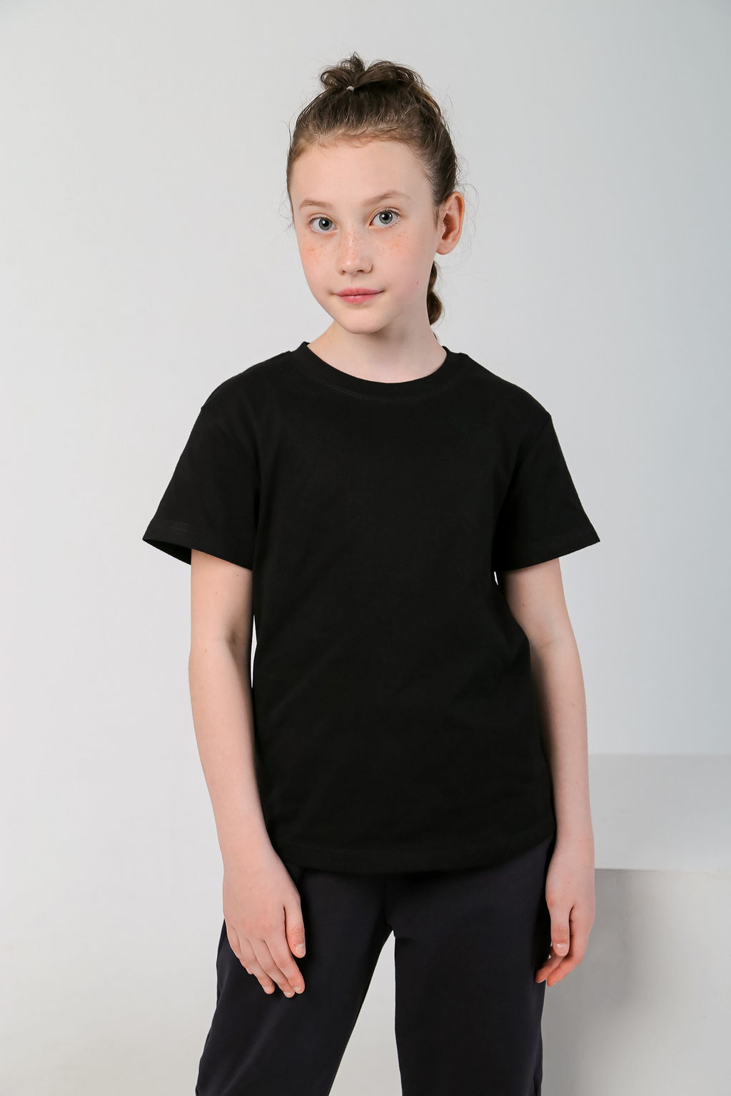 Базовая футболка для девочки, из кулирки плотностью 160г/м2. Модель со слегка спущенной линией плеч и округлым вырезом горловины.