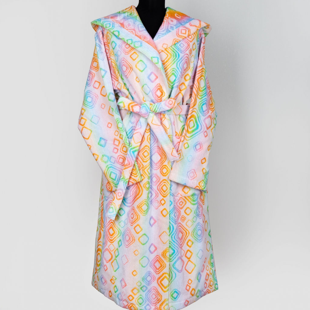 Артикул: 7с51.202.1 Тип ткани: Махровая Состав: 100% Хлопок Вид оформления: Жаккардовая Цвет: св. радужка Применение: Баня, Ванная, Женский Производитель: Беларусь Характер рисунка: Абстракция, Геометрия Оттенок цвета: Белый , Оттенки жёлтого, оранжевого цветов , Оттенки розового , Оттенки синего Упаковка: пакет пвх Размер, см: 170-176/96 Тип изделия: Халат Плотность, г/м?: 315 Пол: женский