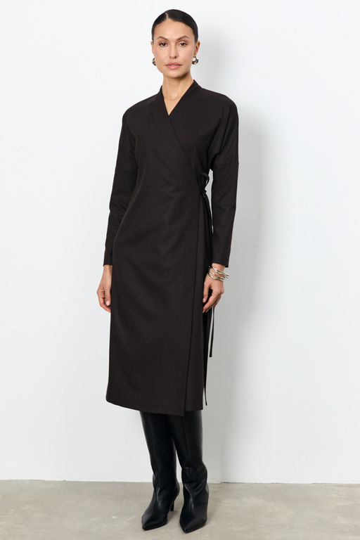 Платье прямого силуэта из плательной ткани. Глубокий V-образный вырез горловины плавно переходит в запах, фиксируется притачным поясом. Втачной длинный рукав в спущенную пройму.