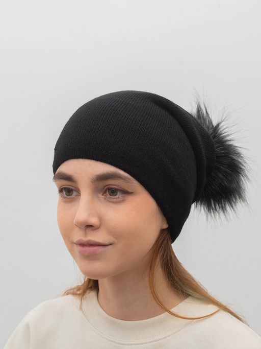 Шапка носок с меховым помпоном. LOUISE 038 аксессуар из тонкого трикотажа черного цвета. Сбоку головной убор дополняет небольшой металлический логотип бренда.