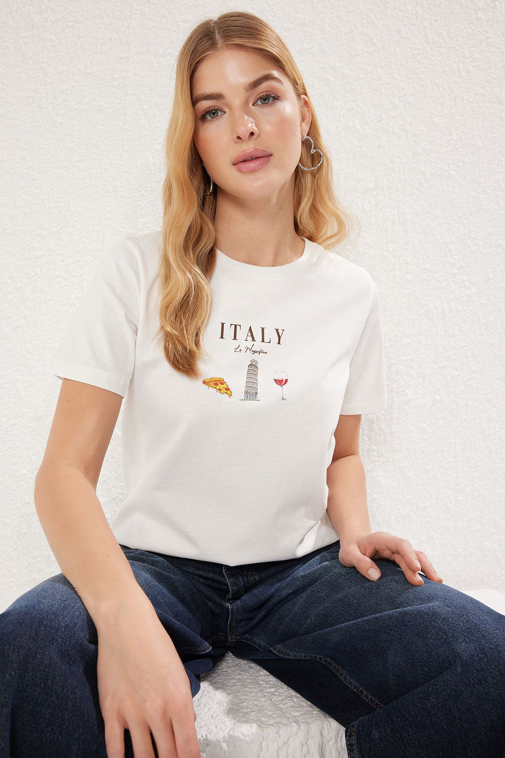 Ekru %100 Pamuk Regular/Normal Kal?p Slogan Bask?l? Orme T-Shirt TWOSS25TS00047