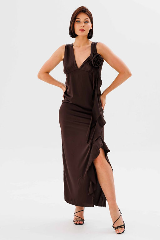 Платье в длине миди, выполнено из шелка армани, лиф отрезной, по переду сбоку обработан вырез с воланом. Застежка - потаная молния в боковом шве. Декор в виде цветка с воланами отстегивается.­