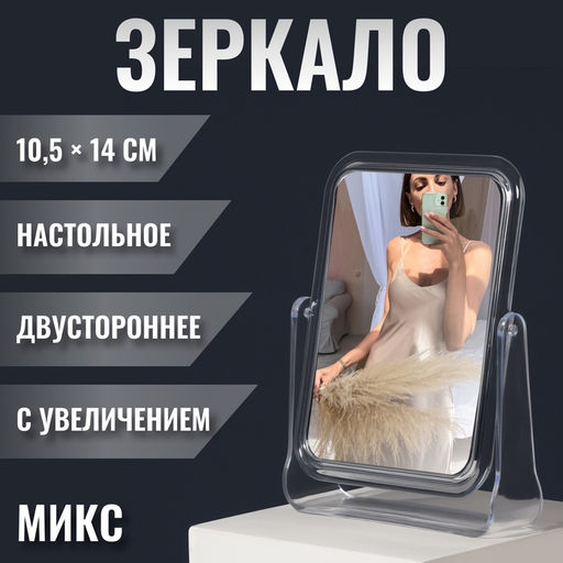 Изящное зеркало на подставке — украшение для туалетного столика. Конструкция не расшатывается и устойчиво держится на поверхности. Аксессуар с минималистичным дизайном впишется в интерьер и станет его гармоничным дополнением. Набор: Нет. Форма: Прямоугольная. Ширина, мм: 135. Высота, мм: 175. Количество зеркал: 2. Тематика праздника: Универсальная тематика. Вид установки: Настольный. Вид зеркала: На подставке. Вид зеркала: Настольное. Поворотная конструкция: Да. Особенность зеркала: С увеличением. Наличие расчёски: Нет. Наличие фоторамки: Нет. Назначение по помещениям: Спальня. Назначение по помещениям: Гостиная. Назначение по помещениям: Ванная. Назначение по помещениям: Прихожая. Бесплатная доставка: Да. Размеры товара: 13.5/3.5/17.5. Примечание: Транспортировочная коробка может иметь дефекты.. Примечание: Выбор конкретных цветов и моделей не предоставляется. На фотографиях могут быть представлены не все варианты..
