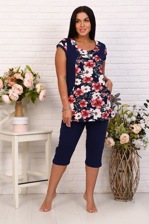 Костюм женский с бриджами. Футболка с рельефами контрастного цвета. Карман расположен в рельефном шве. Рукав "крылышко" обработан кантом. Горловина круглая с обтачкой. Низ кофты обработан плоским швом. Бриджи на резинке, низ - плоский шов.