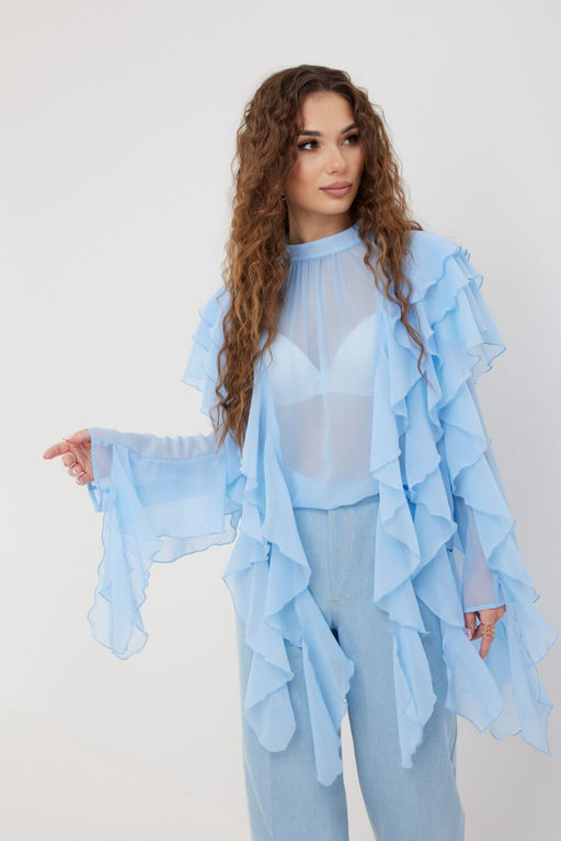 Блузка женская свободного силуэта, с воздушными воланами по переду, спинке и рукавам, вставленными в подрезы. Воланы удлиненные, ниже уровня низа блузки и рукава. По переду сборка по горловине, воротник-невысокая стойка. Спинка с кокеткой, обработанным разрезом вверху кокетки, и застежкой на две небольшие пуговицы и петли на стойке.