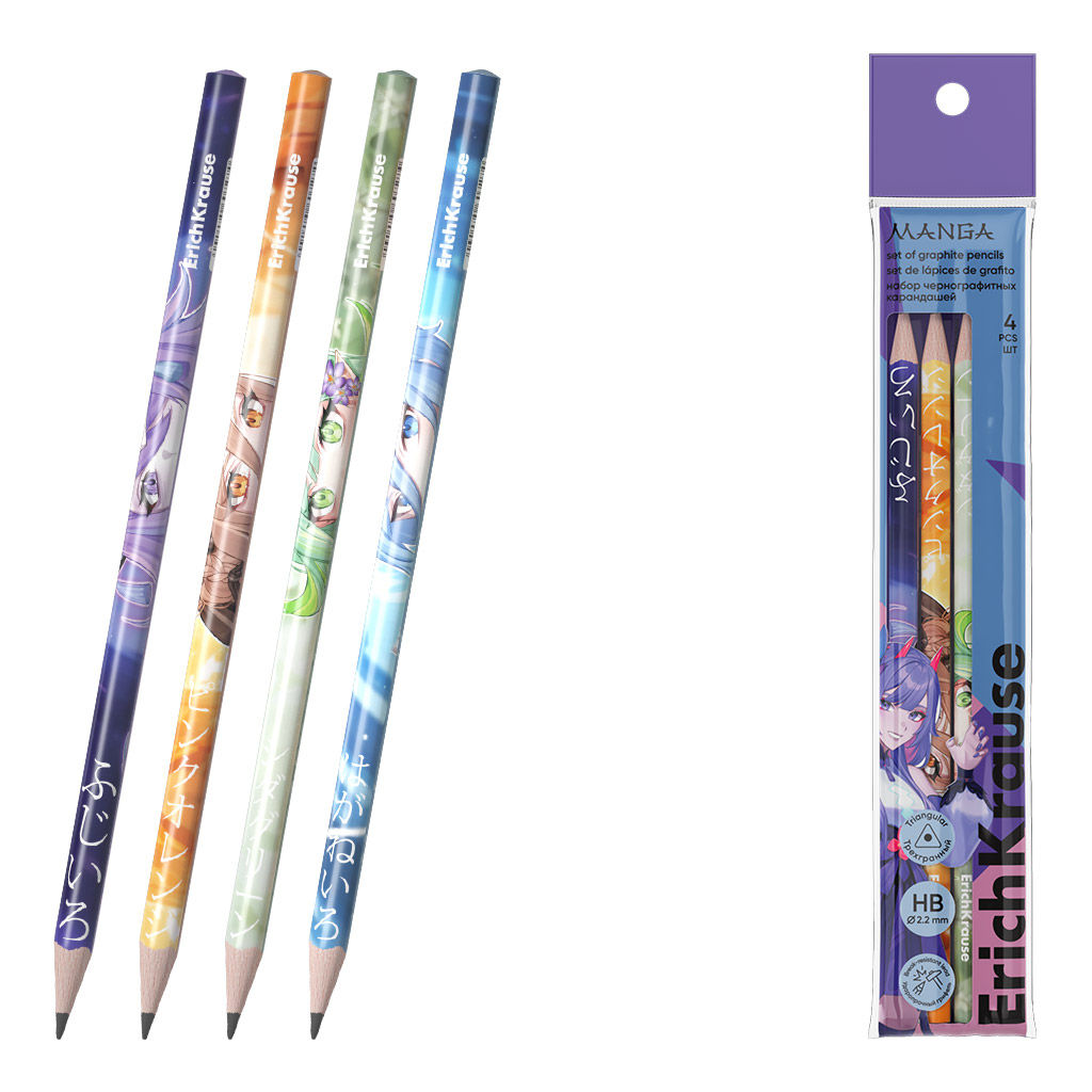 • АКЦИЯ Цена за 36 шт. Набор из 4 чернографитных карандашей ErichKrause Manga, трехгранный, НВ (в пакете)