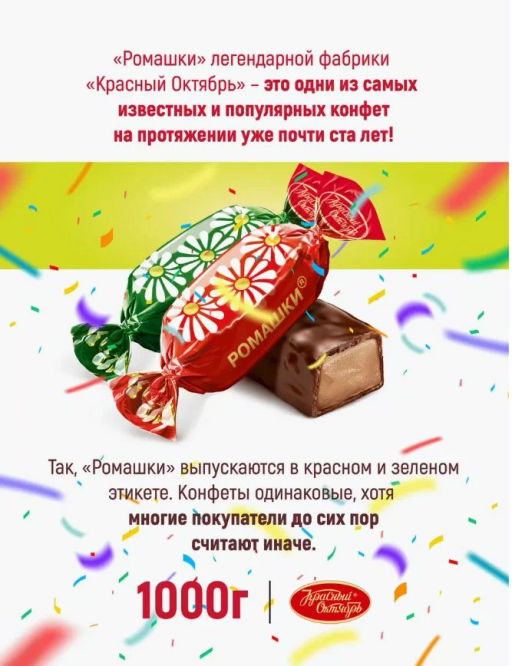 Описание товара Конфеты "Ромашка" фабрики "Рот Фронт" - нежное удовольствие с ярким вкусом и ароматом. Тающая светлая помадка со вкусом крем-брюле. Мягкий сливочный привкус и яркий коньячный аромат с ванильными нотками - вкус этих конфет любим сладкоежками всех возрастов, а вид красных и зеленых фантиков знаком с самого детства. Состав: сахар, шоколадная глазурь (сахар, эквивалент масла какао (рафинированные дезодорированные, фракционированные, негидрогенирированные растительные масла (пальмовое, ши)), какао порошок , эмульгатор лецитин соевый Е476, ароматизатор Ванильный), сгущенное с сахаром молоко, вода питьевая, патока, заменитель молочного жира (рафинированные дезодорированные, фракционированные, частично гидрогенирированные растительные масла (пальмовое, подсолнечное, пальмоядровое), антиокислитель токофероллы концентрат смеси), спирт этиловый ректификованный, ароматизаторы: Ром, Коньяк,Ванильный. Противопоказано при индивидуальной непереносимости белка молока. Пищевая ценность в 100 г продукта: белки - 3 г, жиры - 14 г, углеводы - 74 г. Энергетическая ценность в 100 г продукта: 1830 кДж (430 ккал). Хранить при температуре от +15 градусов Цельсия до +21 градусов Цельсия и относительной влажности воздуха не более 75 %. 2IKZ10