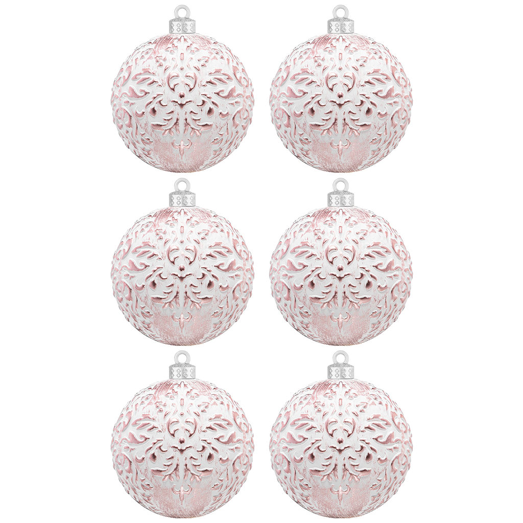 • Набор 6 новогодних шаров 8*8 см "Белый с розовым" с эффектом старины