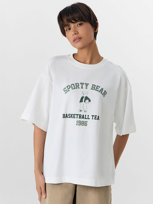 Белая женская футболка оверсайз с надписью Спортивный мишка. Баскетбольная команда 1986 выбор для расслабленного образа с винтажным настроением. Она выполнена из натурального хлопка, который дышит и дарит коже приятную мягкость. Свободный крой со спущенной линией плеча и короткие рукава создают непринуждённый силуэт, в котором вы будете чувствовать себя комфортно в любой ситуации.