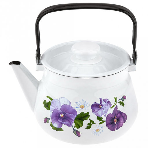 • "Анютины глазки" Чайник эмалированный 2,5л, д9см, h13,6см, s0,08мм, двойной слой эмалевого покрытия, сферическая форма, металлическая крышка, металлическая подвижная ручка (Россия)
