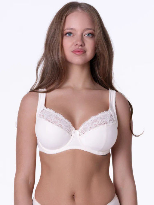 Мягкая чашка с боковой корректирующей деталью. Нижние детали чашки и боковая корректирующая деталь ламинированы хлопком. Верхняя деталь чашки декорирована кружевом. Ластовица уплотнена неэластичным сетчатым трикотажным полотном для стабилизации каркасов. Широкая комфортная бретель выполнена с обработкой в два приема и ламинирована дублированным полотном с хлопком. Стан выполнен из эластичного трикотажного полотна. 30% Хлопок,60% Полиамид,10% эластан.