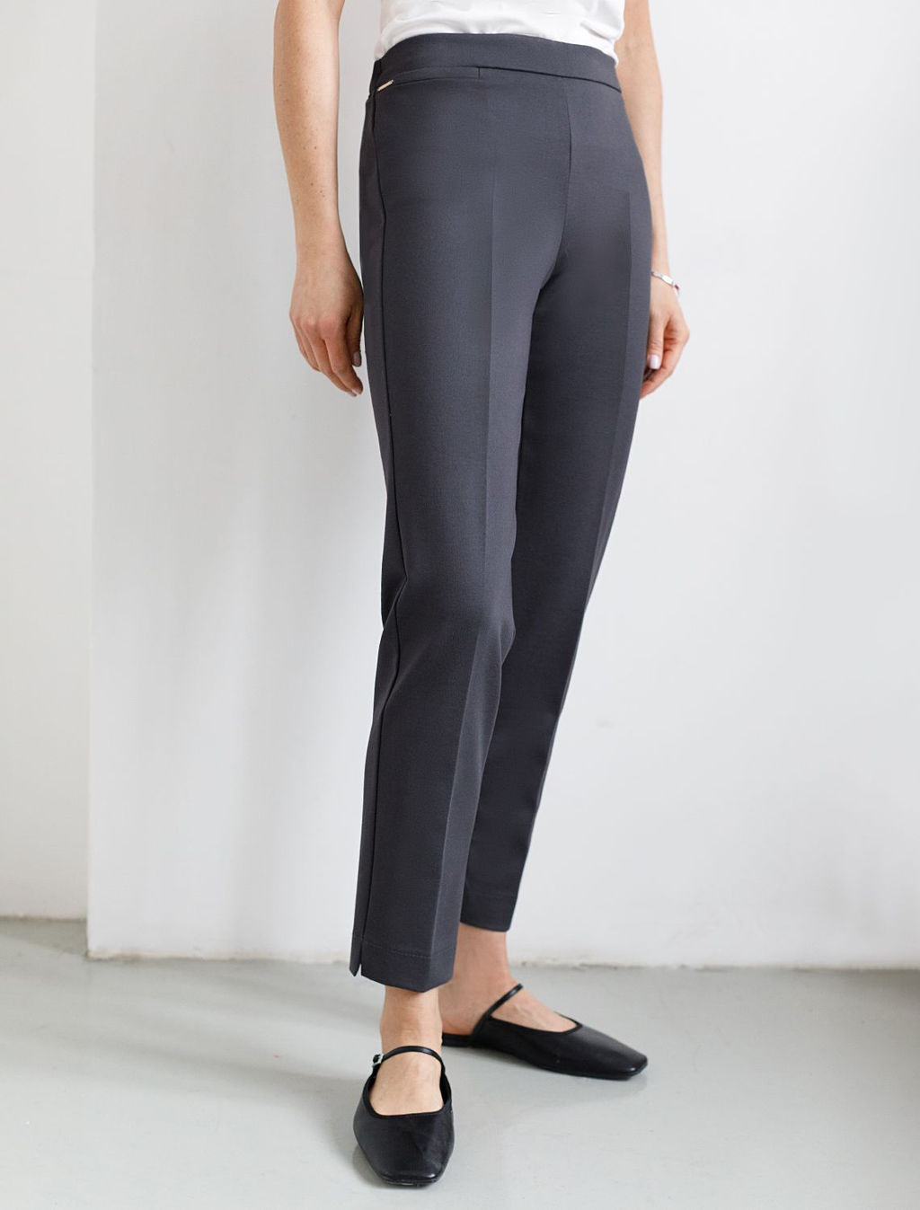 Брюки-дудочки выполнены из джерси. Модель дополнена резинкой сзади, одним вместительным карманом спереди и небольшими боковыми разрезами. Заутюженные стрелки и посадка на талии визуально вытягивают силуэт. Изделие хорошо держит форму, отлично тянется и почти не мнется во время использования. Идеальный вариант в офис или в повседневный классический стиль.­