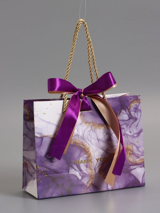 • Пакет подарочный ламинированный «Мрамор», фиолетовый с бантиком, 19×15×7 см