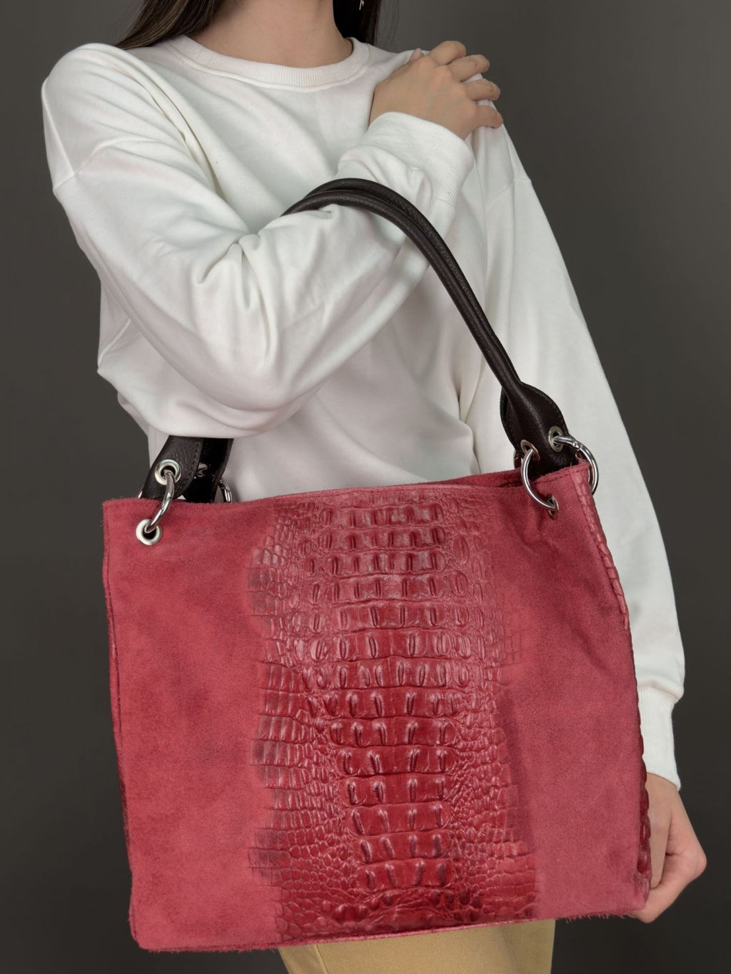 Страна: Италия Акции: Товары со скидкой Производитель: Pelletteria Luisa, Italy Размер: большая Стиль ношения: длинные ручки на плече Форма: мягкая Выделка кожи: замшевая под крокодила Цвет кожи: Красный Оттенок: темно-красный с тиснением под крокодила Палитра цветов: TB-163 Caimano Размеры: длина: 36 см \tвысота: 30 см \tширина: 12 см Описание: Отличная просторная женская сумка из натуральной кожи, производство Италия. Базовая коллекция, ХИТ Sefaro. Шикарная выделка кожи, замшевая с тиснением под крокодила, мягкая лаконичная форма и оригинальные крупные кольца фурнитуры придают сумочке дорогой и респектабельный вид. Функциональность этой модели на высоте, сумочка сочетается с вещами в стиле Casual, будет органично смотреться в классическом, деловом, винтажном либо повседневном образах. Закрывается на молнию сверху. Внутри: 2 больших отделения, разделенных перегородкой с карманом на молнии. 1 карман на боковой стенке на молнии и карман для мобильного телефона. На обратной стороне снаружи имеется карман на молнии. Без преувеличения шикарная сумка в сложном и притягательном богемном стиле. Богемный стиль, к которому восходит столь популярное сегодня бохо, предполагает в своей основе развернутое сравнение творческой интеллигенции с цыганами, отсюда и важная для него многослойность. То есть стилизуется отнюдь не цыганский шик, а способность актерско-художнической среды подручными средствами добиваться экстраординарного эффекта. Веселая или драматичная эклектика элементов этники, винтажа, классики и вообще чего угодно не предполагает рецептов, но требует творческой интуиции и отменного вкуса, а главное - способности и смелости выразить свой взгляд на мир. Эта сумочка может быть прекрасным дополнением к бохо-гардеробу. Ее форма - это интересный компромисс классического прямоугольника и хипповской сумки-торбы. Декоративные элементы в виде крепящих ручки крупных металлических колец привносят необходимый этно-колорит. И достойное завершение композиции - шикарная выделка кожи с тиснением под питона или крокодила.