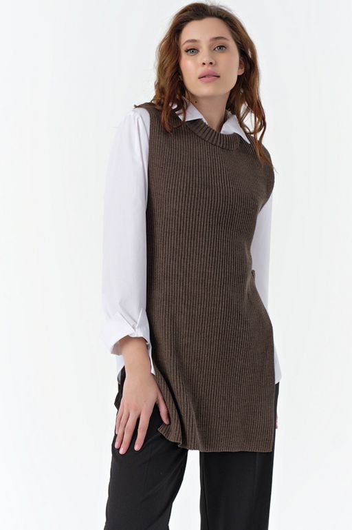 Жилет вязаный удлиненный с разрезами по бокам из хлопка кофейный