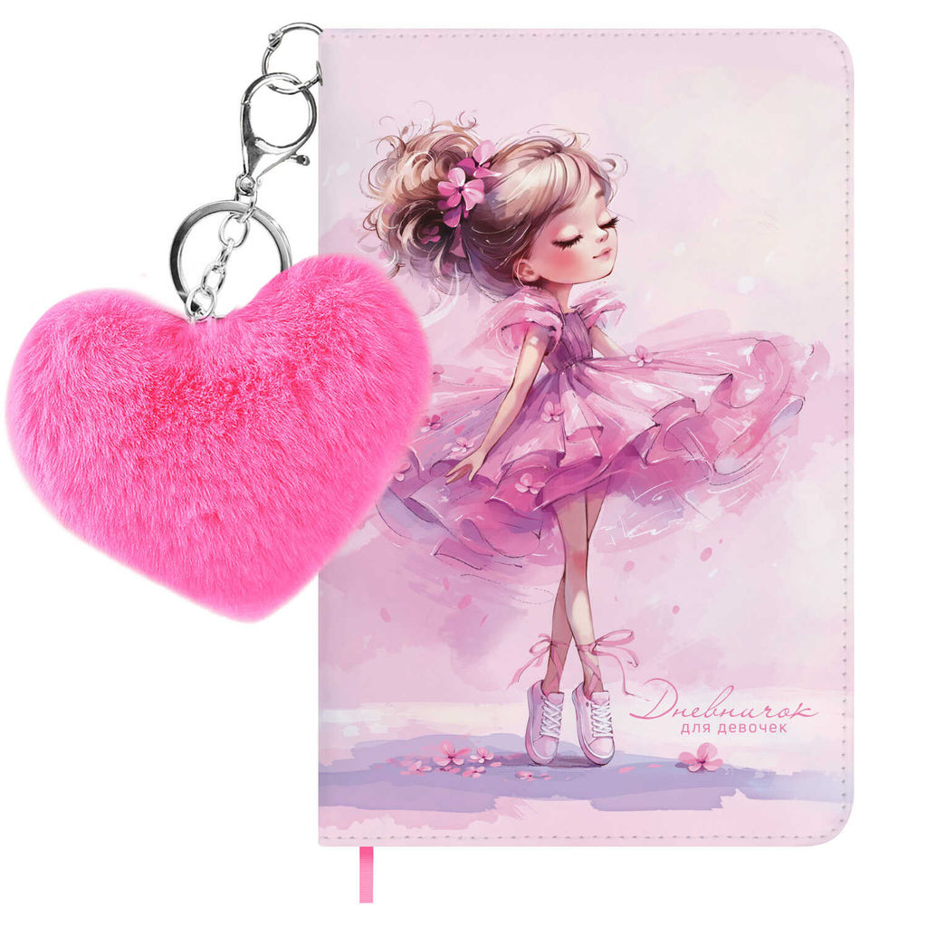 Дневничок для девочек, А6+, 96 л., арт. 72824/ 20 БАЛЕРИНА В КЕДАХ (кожзам: 126x195 мм, твёрдый переплёт с поролоном, материал обложки: искусственная кожа "Наппа", способ крепления блока: ниткошвейный, декор: аппликация из меха, печать полноцветная, вн. блок: 96 л., белый офсет 70 г/м?, печать в одну краску (линия), справочный материал: нет, закладка/-и: одно ляссе, форзац: печать в одну краску, особенности: брелок из искусственного меха в комплекте, инд. упаковка: ПЭТ-пакет)