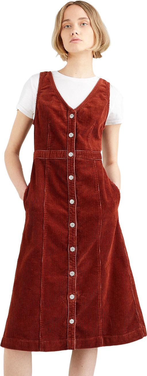 Вельветовое платье миди без рукавов Levis Frances Denim Dress проходит через бюст и талию, создавая эффектный силуэт. Вшитый пояс подчеркивает талию.