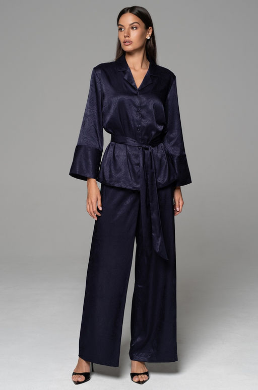 Классический комплект-двойка Mia-Amore состоит из жакета с длинным рукавом и широких брюк. Изделия комплекта выполнены из смесового шелкового жаккардового полотна. В комплекте широкий пояс. Состав:70% натуральный шелк, 25% полиэстер, 5% эластан