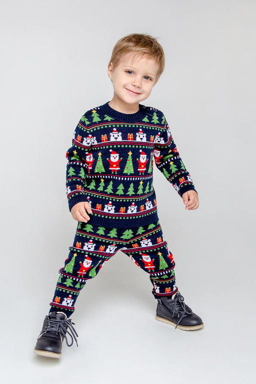 Тёмно-синий вязаный комплект для мальчика: джемпер с круглой горловиной и брюки. Украшен вывязанным новогодним узором. Горловина, манжеты и пояс связаны ластиком. Брюки на резинке.. Состав: 70% акрил, 30% шерсть