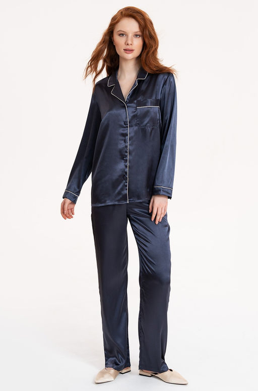 Комплект Mia-Mella состоит из жакета с центральной застежкой на пуговицыи длинными рукавами и брюк. Комплект выполнен из искусственного шелкового полотна с атласным блеском. Рукава, борт, карманы жакета и низ брюк декорированы контрастным кантом. Состав:100% полиэстер
