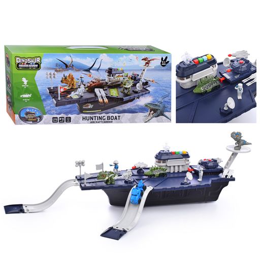 Авианосец с двумя машинками, двумя динозаврами, танком (стреляет 4 снарядами) и другими аксессуарами (две фигурки, орудия корабля, наклейки).