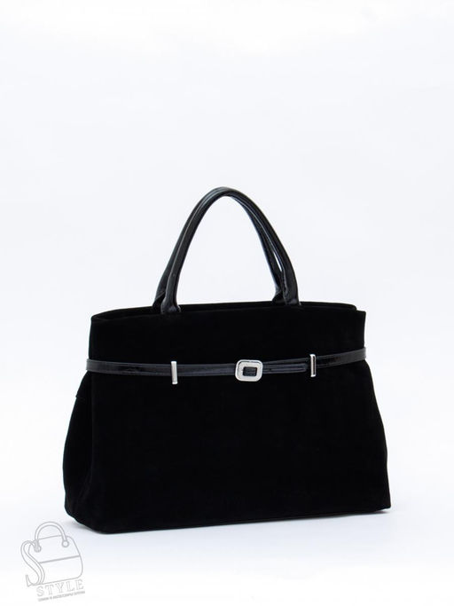 Базовая сумка, выполнена из замши. Декорирована ремнем на корпусе. Дополнена серебристой фурнитурой.  Данная модель закрывается на молнию. Носится  в руке за встроенные ручки или на плече. В комплекте имеется ремень с регулировкой длины. Каркас мягкий.