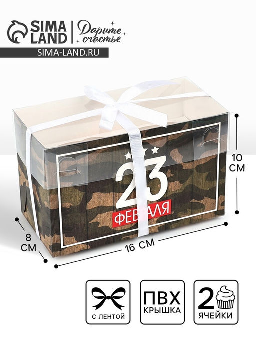Цена за 5 шт. Коробка для капкейков, кондитерская упаковка, 2 ячейки «23 Февраля», 16×8×10 см