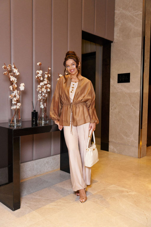 Предназначен для повседневного использования. Топ и брюки выполнены из смесовой ткани с содержанием натуральных волокон, блузка-жакет из невесомой и эффектной ткани вуаль.