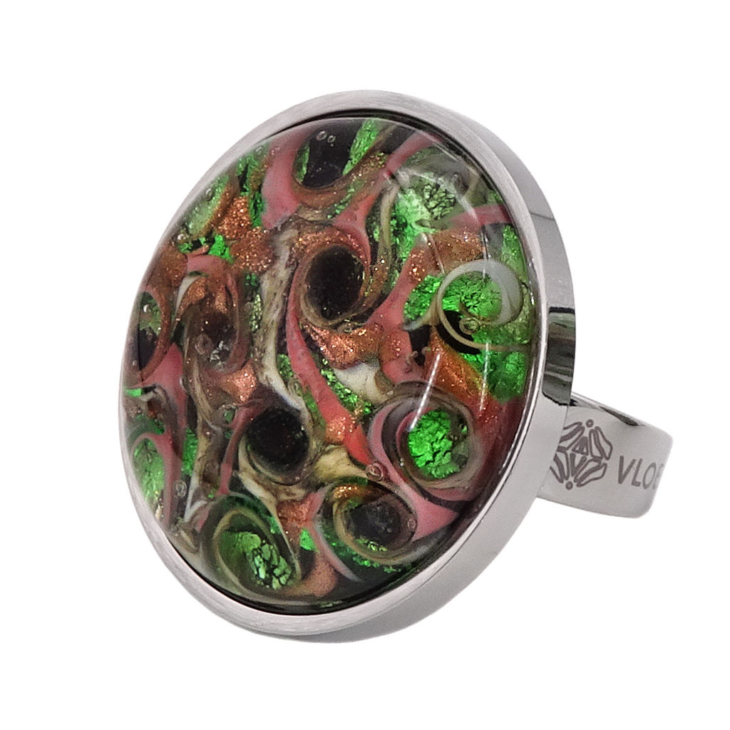 Кольцо изготовлено из муранского стекла и гипоаллергенной ювелирной стали, что очень важно для людей с чувствительной кожей. Металл не темнеет и не подвергается воздействиям окружающей среды, надолго обеспечивая красивый внешний вид изделия. Диаметр стеклянного элемента - 2,5 см. Кольцо безразмерное, регулируется с 16 до 19 размера. Вес - 12 гр.