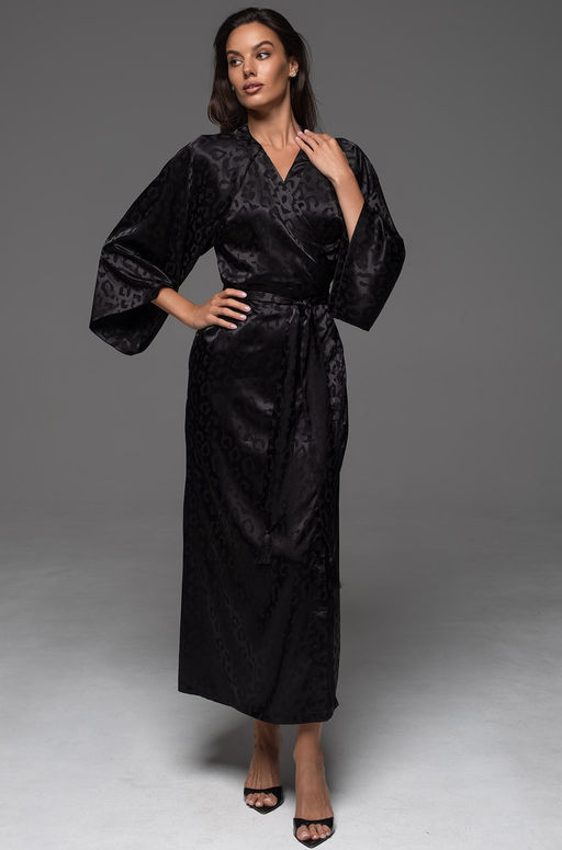 Длинный запашной пеньюар Mia-Amore с широкими длинными рукавами. Изделие выполнено из искусственного шелка на жаккардовой основе. По бокам пеньюара расположены карманы. Полы изделия фиксируются за счет широкого пояса с кисточками. Состав: 100% полиэстер