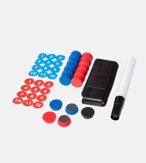 Дополнительный набор фишек для тактической доски JOGEL. Состоит из пронумерованных фишек разных цветов, маркера, губки для стирания.