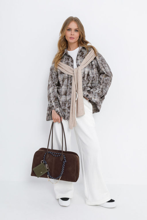 Детали: рубашка прямого силуэта, спущенная линия плеча, накладные карманы, застежка на петли и пуговицы, удлиненные рукава с притачными манжетами, имитация рукавов из трикотажа. Брюки с высокой посадкой, эластичный пояс с резинкой, боковые карманы, без застежки.