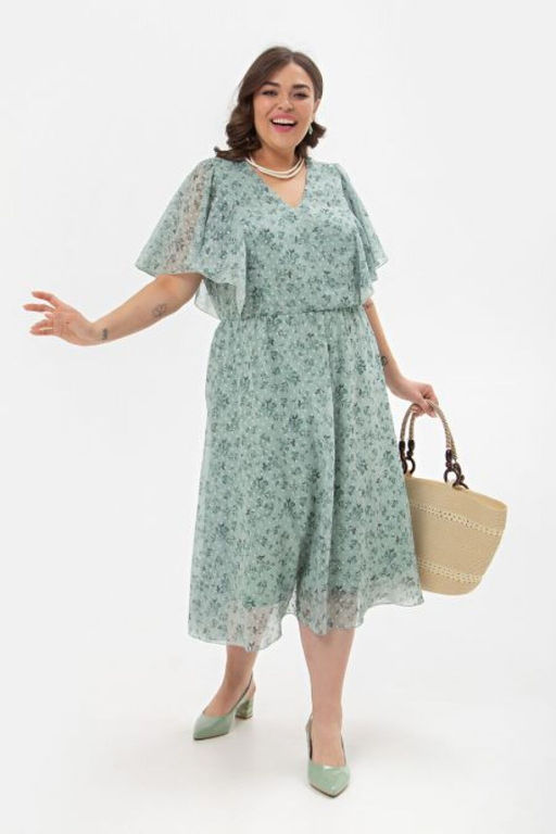 Женственное платье приталенного силуэта из легкого шифона в мелкий принт. Модель на трикотажной подкладке. V - образный вырез горловины - открывает зону декольте подчеркивая линию шеи. Втачные  укороченные рукава - крылышки придают модели романтичности. Прилегающий лиф подчеркнут вертикальными рельефами, талия на резинке. Низ платья расклешенный, с мягкими складками. Низ изделия и рукавов обработан аккуратным ролевым швом. Замечательный выбор для выхода и встречи с друзьями.­