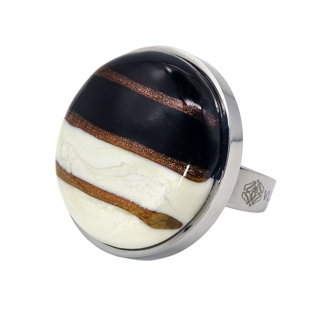 Кольцо изготовлено из муранского стекла и гипоаллергенной ювелирной стали, что очень важно для людей с чувствительной кожей. Металл не темнеет и не подвергается воздействиям окружающей среды, надолго обеспечивая красивый внешний вид изделия. Диаметр стеклянного элемента - 2,5 см. Кольцо безразмерное, регулируется с 16 до 19 размера. Вес - 12 гр.