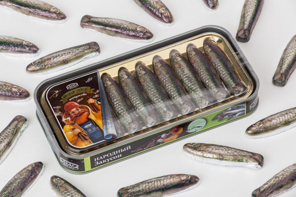 Конфеты в шоколадной глазури в форме рыбок со светлой начинкой и сливочным вкусом.