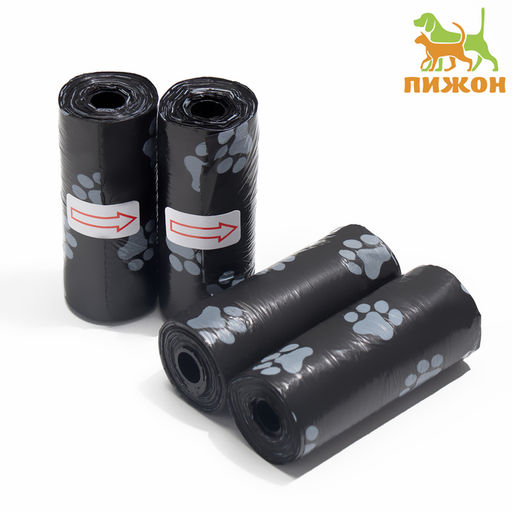 Пакеты для уборки за собаками «Лапки», 4 рулона по 15 пакетов, 29×21 см, с печатью, чёрные