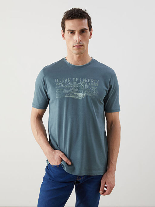 • Bisiklet Yaka Bask?l? Penye Biyeli Erkek Ti??rt