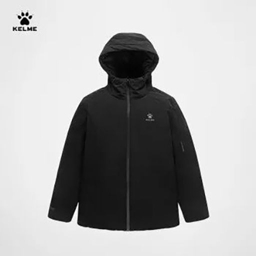 Пуховик Kelme с капюшоном. Изготовлен из практичного ветро-и влагозащитного материала с наполнителем из утиного пуха. Застежка на скрытую молнию. Капюшон с воротником-стойкой и эластичным шнурком для надежной защиты от ветра в непогоду. Боковые карманы для рук и хранения различных мелочей. В рукава вшиты трикотажные манжеты для дополнительной защиты от ветра. Фирменный принт логотипа в тон пуховика.