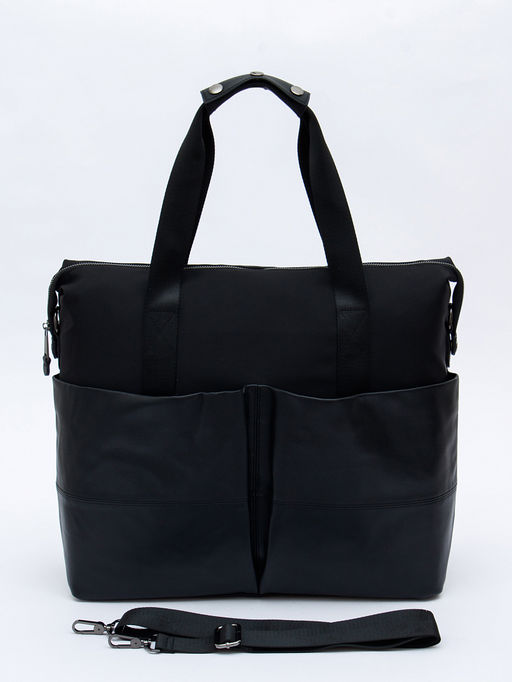 Дорожная сумка, выполнена из текстиля и кожи. Дополнена серебристой фурнитурой. Данная модель закрывается на молнию, носится в руке или на плече с помощью ремня. В комплекте предусмотрен ремень-стропа с регулировкой длины. А так же встроенные ручки. Каркас мягкий.