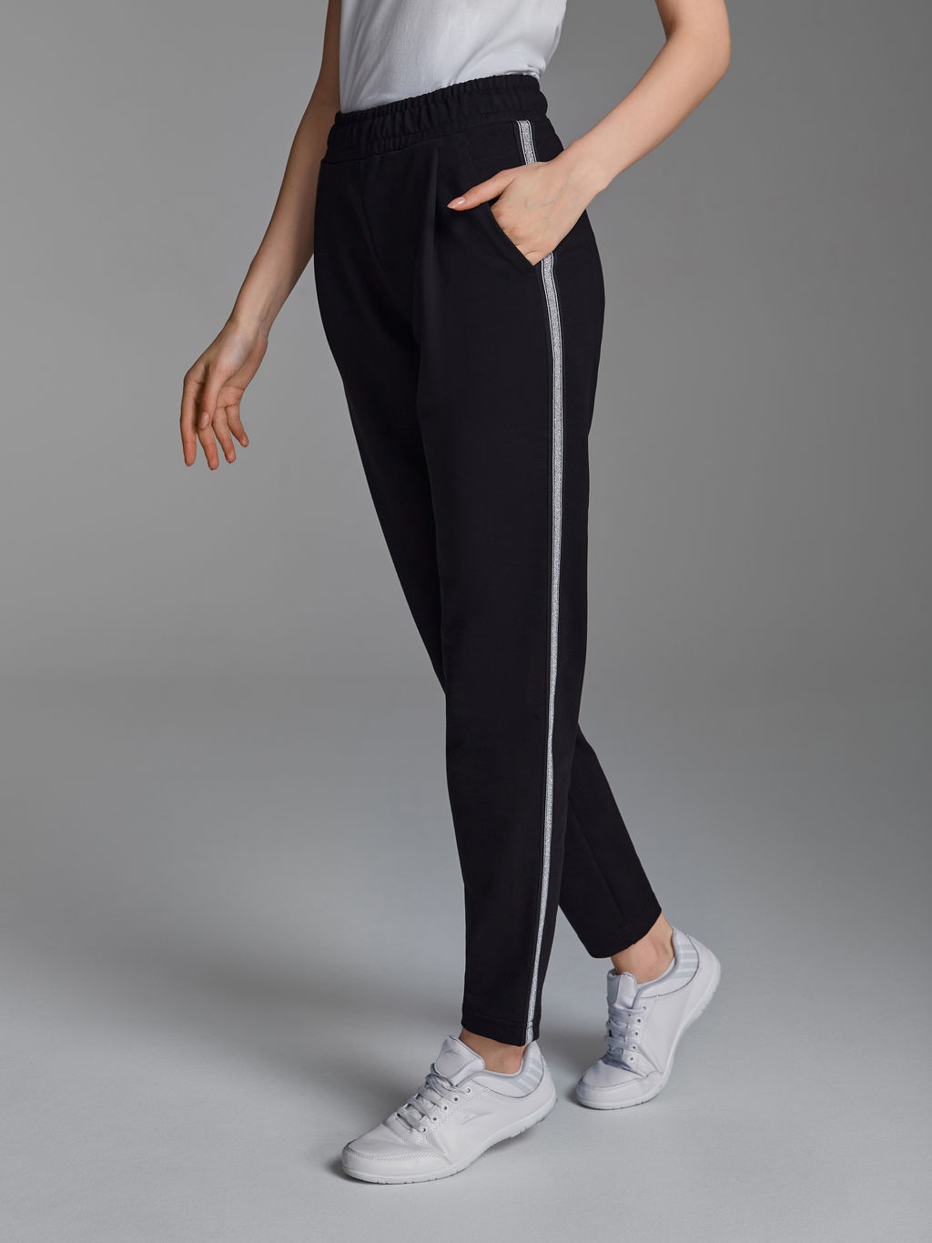 Брюки женские из хлопкового трикотаж в стиле "каррот" с небольшими складками по линии талии. Карманы брюк прорезные, с боковыми вставками. Вдоль боковых швов брюк нашита декоративная трикотажная лента с серебристой нитью. Низ брюк заужен. Пояс брюк настрочен на эластичную резинку, дополнительно регулируется шнуром.