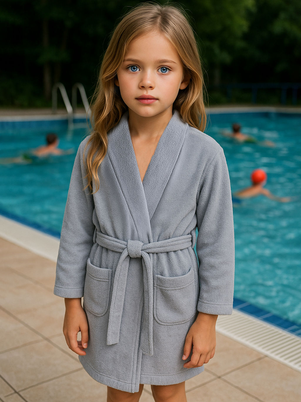 Махровый банный халат на запах в однотонном цвете с поясом. Рукава полноразмерные, низ подогнут, прошит. Край обработан широкой махровой бейкой. Низ халата подогнут и прошит. Подходит мальчикам и девочкам.