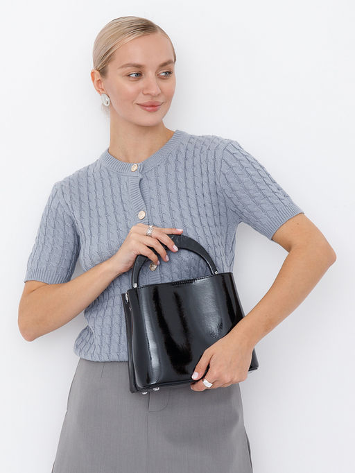 Сумка-торба, выполнена из натуральной лаковой кожи. Дополнена серебристой фурнитурой. Данная модель закрывается на молнии, носится в руке или на плече. В комплекте имеется съемный ремень с регулировкой длины. Каркас полужесткий.