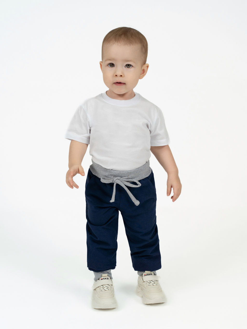 Практичные брюки темно-синие свободного кроя не стеснят движений ребёнка. Модель выполнена из мягкого и плотного футера с добавлением лайкры. Брюки имеют трикотажный пояс со шнуром-утяжкой внутри и глубокие карманы по бокам. Низ штанин обработан эластичными манжетами.